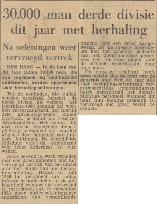 Herhalingsoefening 31-32-33 Zelfstandige Gevechtsgroep – 1959 Verslag uit De Legerkoerier nr 5 1959: Herh. oef. – Legerkoerier nr 5 1959. Uit de kranten: Herhalingsoef ’59 – Tubantia – 15-01-1959