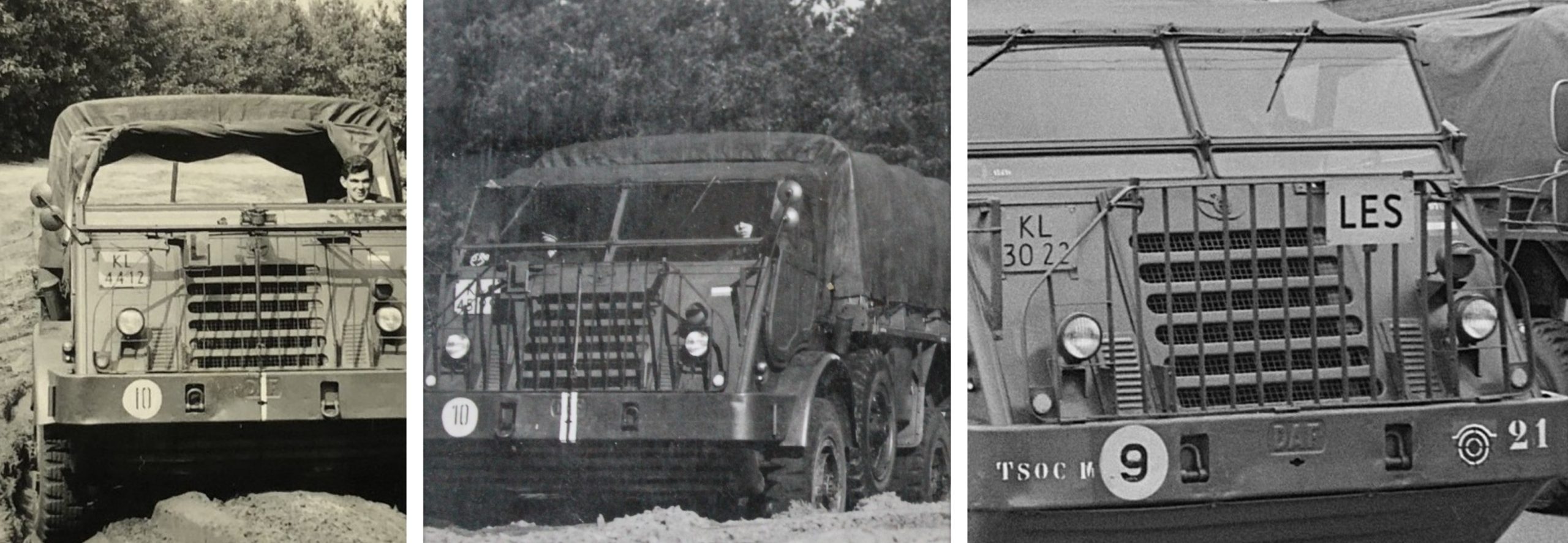 Twee 3-tonners: een DAF YA 314 en 328 van het “G eskadron”. De DAF YA 4442 is wat nieuwer, het wit schilderen van bumpers wordt nog steeds gedaan.