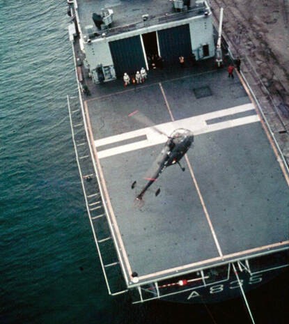 Bijna klaar voor de terugreis. Voor het eerst landt een Alouette op het achterdek van een marineschip.