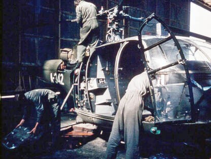 In de haven van Bizerte. Links Montage van de rotorbladen. Rechts Gereed voor afvliegen vanaf de Poolster.